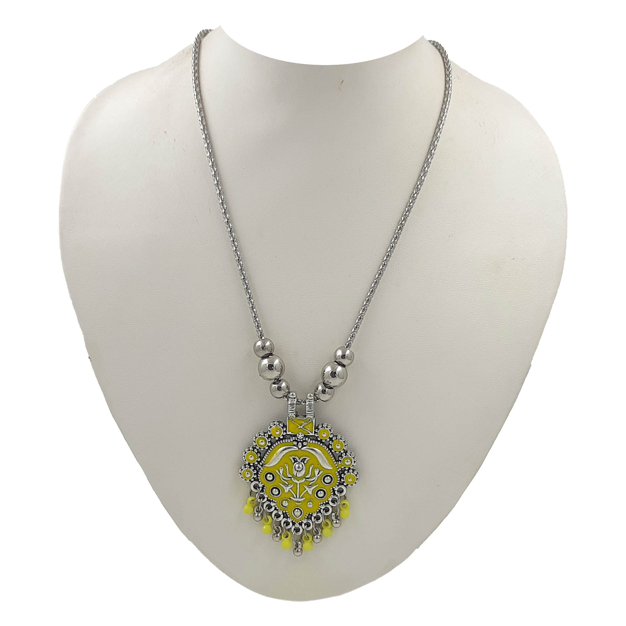 Brighten up your look with this oxidized silver necklace featuring a round floral pendant highlighted with vibrant yellow enamel work. The beaded danglers add movement and charm, making it an eye-catching piece for festive and casual ethnic outfits alike.