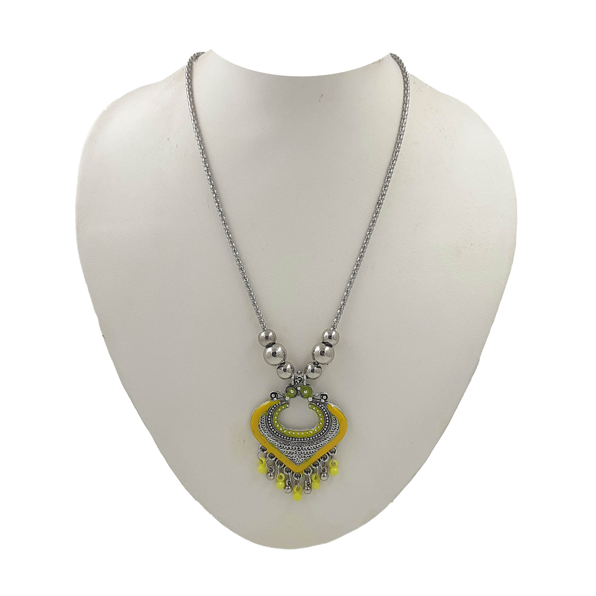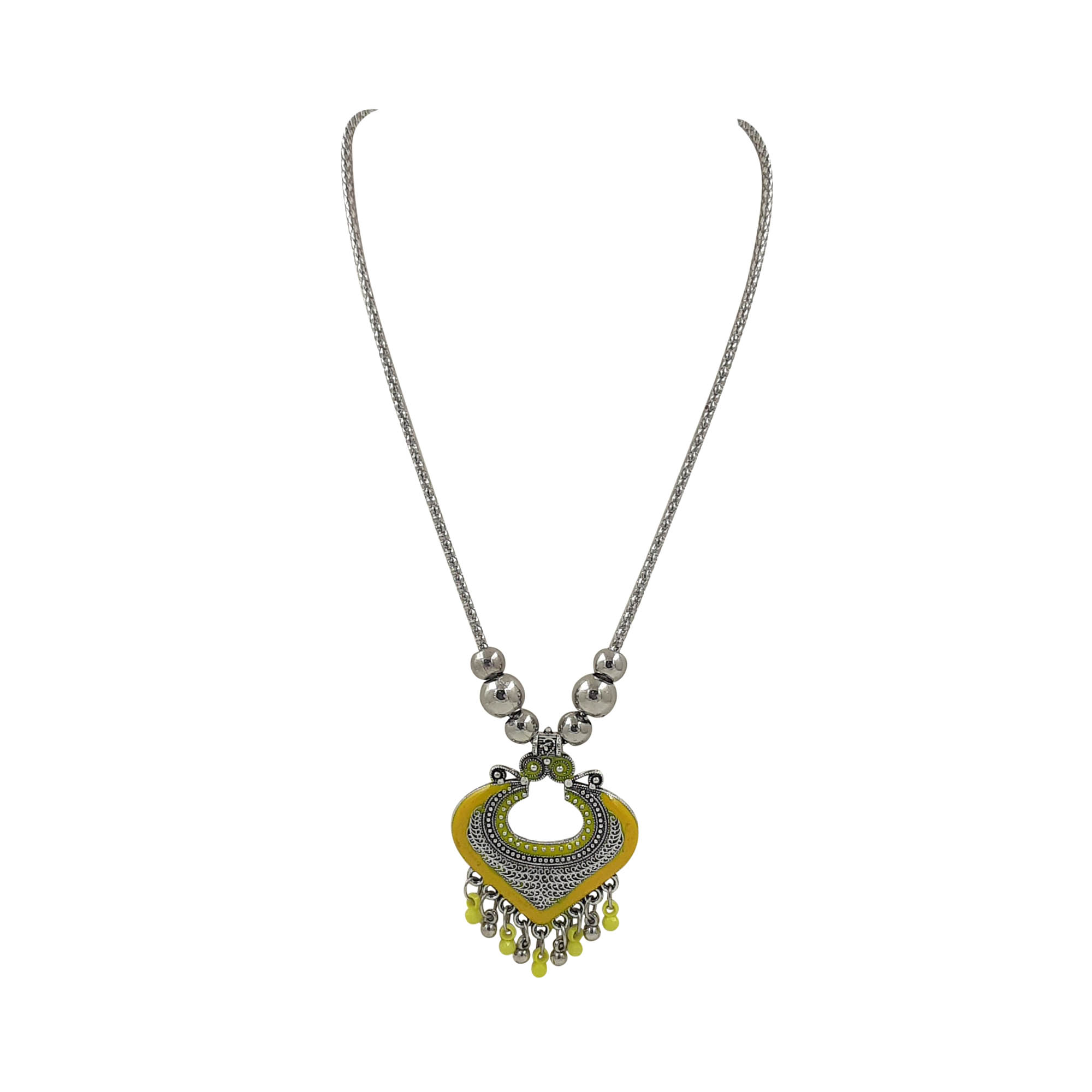 A bold and elegant oxidized silver necklace featuring a heart-shaped pendant with intricate carvings and vibrant Yellow enamel detailing. The design is completed with delicate bead danglers that add movement and charm.