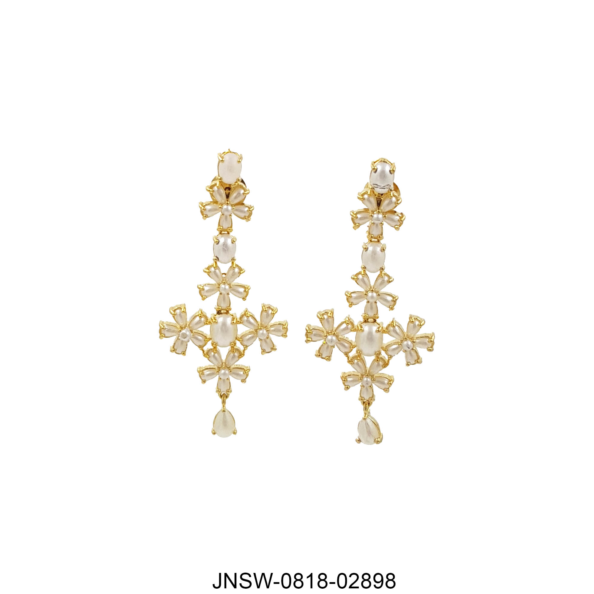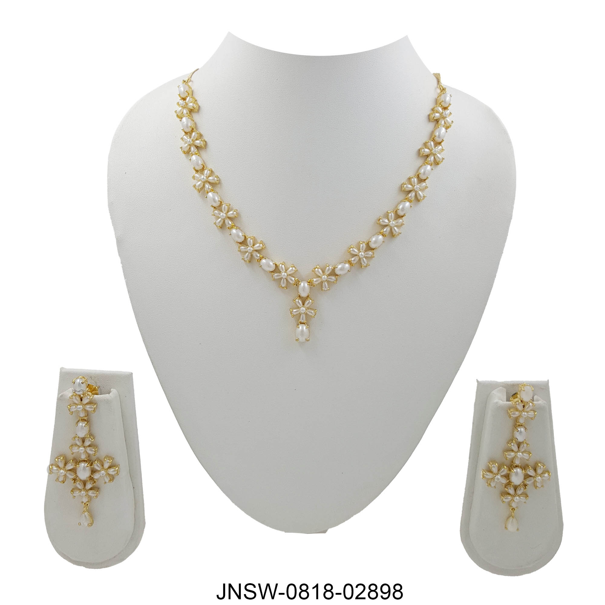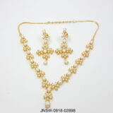 Enhance your traditional charm with this delicate floral pearl necklace set, designed in a soft gold-tone finish. The necklace features intricate flower motifs paired with drop-shaped pearls that add a graceful shimmer to every movement. Perfect for festive celebrations, ethnic functions, and elegant occasions, this lightweight set comes with beautifully coordinated earrings that complete the look effortlessly.