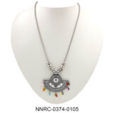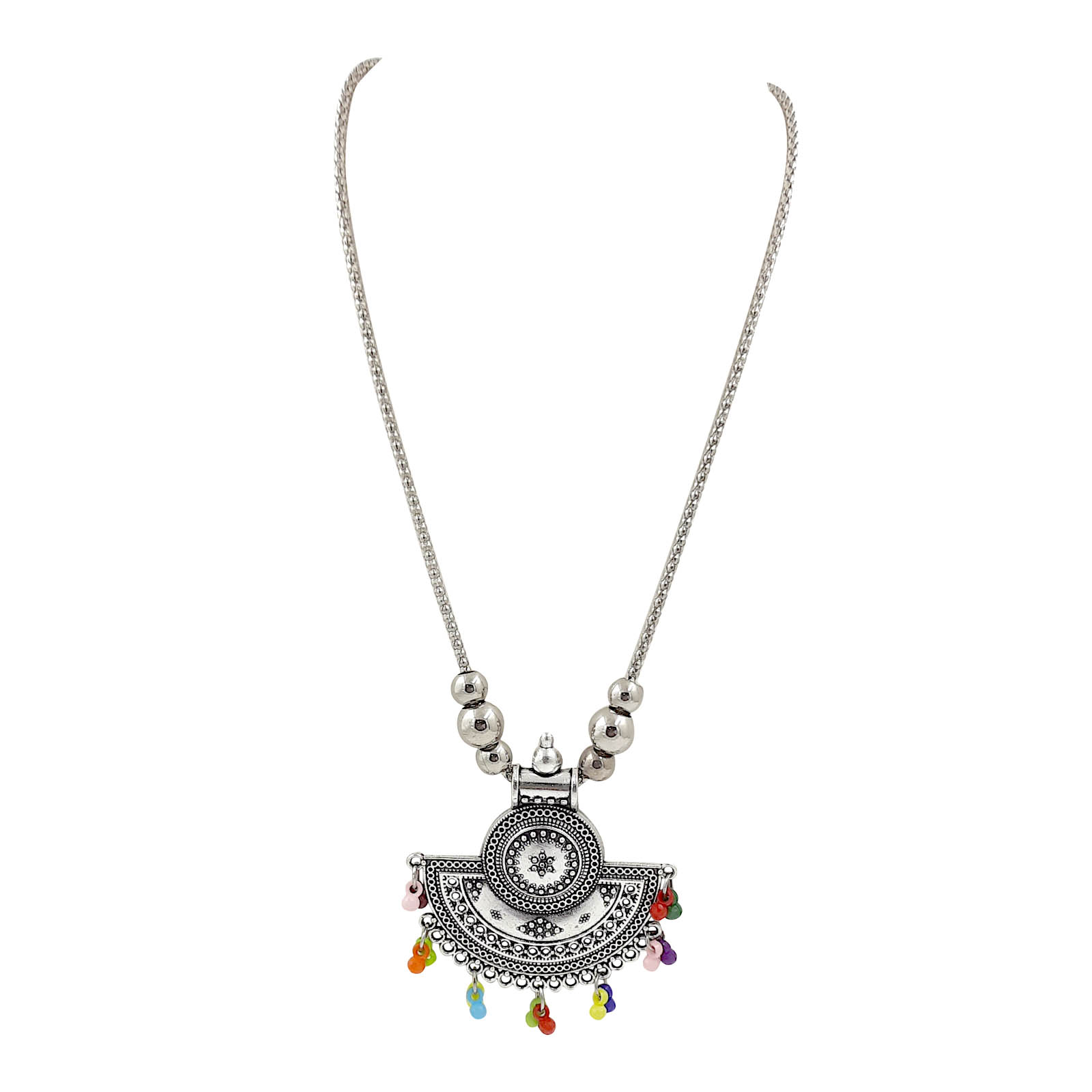 A playful twist on traditional oxidised jewellery, this necklace features a bold half-moon pendant adorned with multicolor bead danglers. It’s vibrant, unique, and the perfect mood-lifter accessory for every occasion.