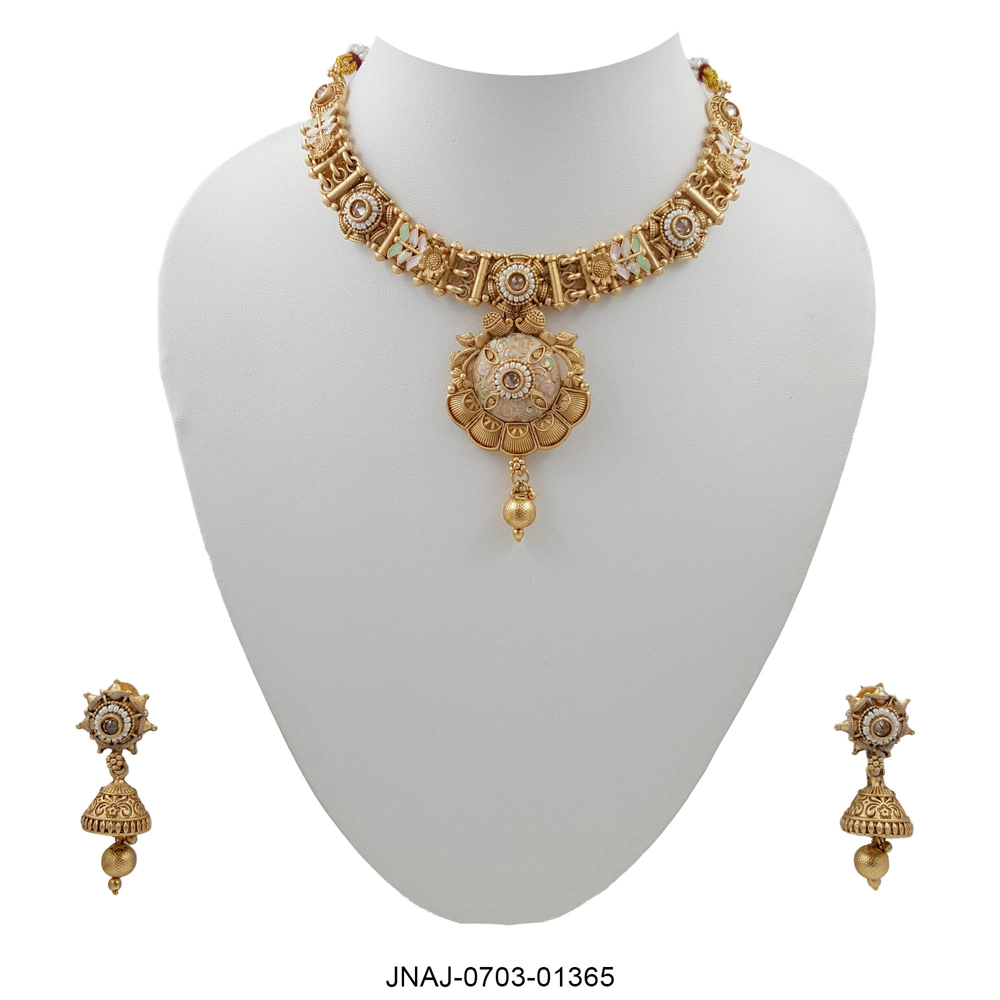 This antique gold necklace set celebrates heritage craftsmanship with its floral medallion centerpiece and intricate detailing. Accented with soft pastel hints and delicate pearl-like motifs, the necklace brings a graceful blend of tradition and elegance. Paired with jhumka-style earrings, it’s a timeless adornment for festive and cultural celebrations.