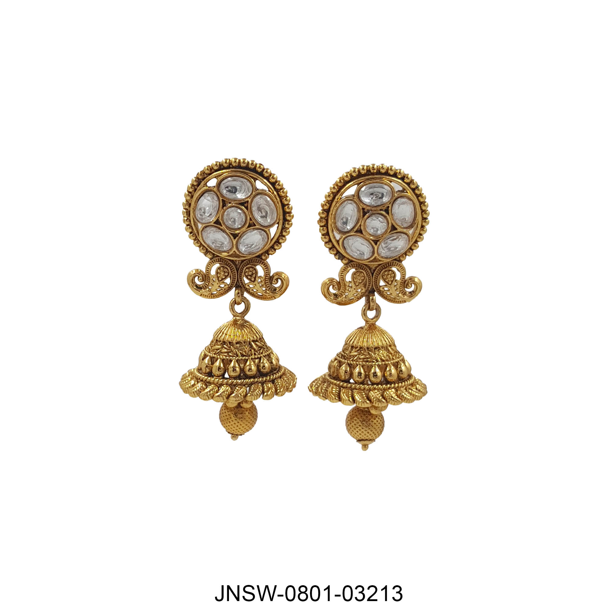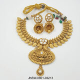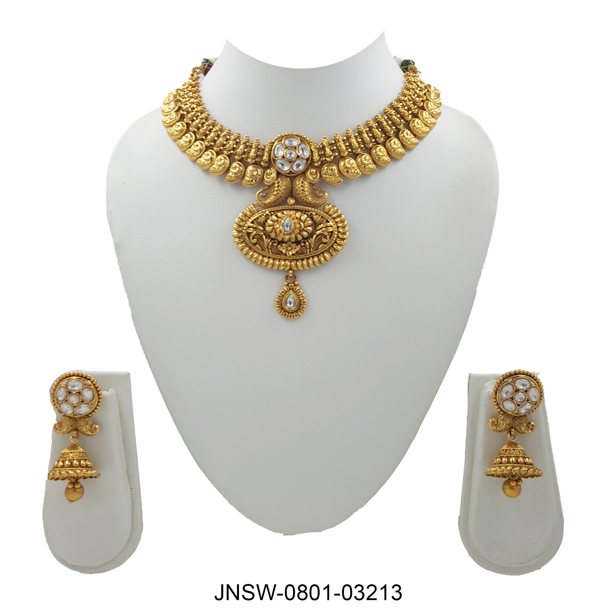 Elevate your festive and wedding looks with this exquisite traditional temple jewellery set, crafted in a rich antique gold finish. The choker-style necklace features intricate coin motifs, floral detailing, and a stunning central pendant embellished with sparkling white kundan stones. Paired with beautifully coordinated jhumka earrings, this set brings timeless charm and regal elegance to every outfit.Lightweight yet statement-making, this heritage-inspired design is perfect for brides, bridesmaids, and anyone who loves classic ethnic glamour.