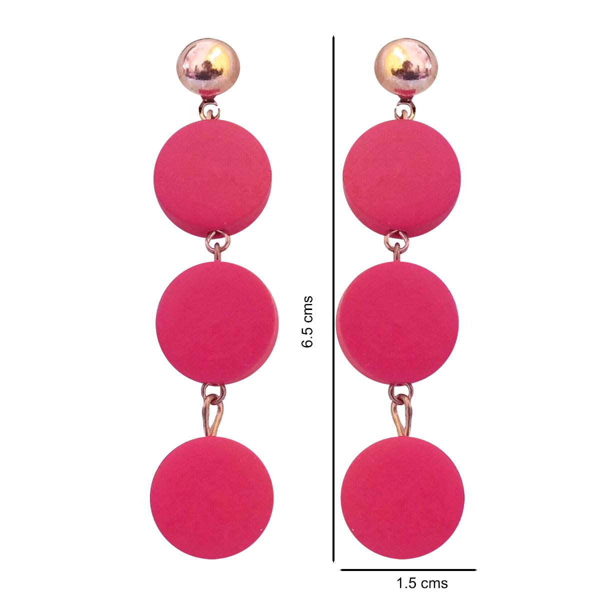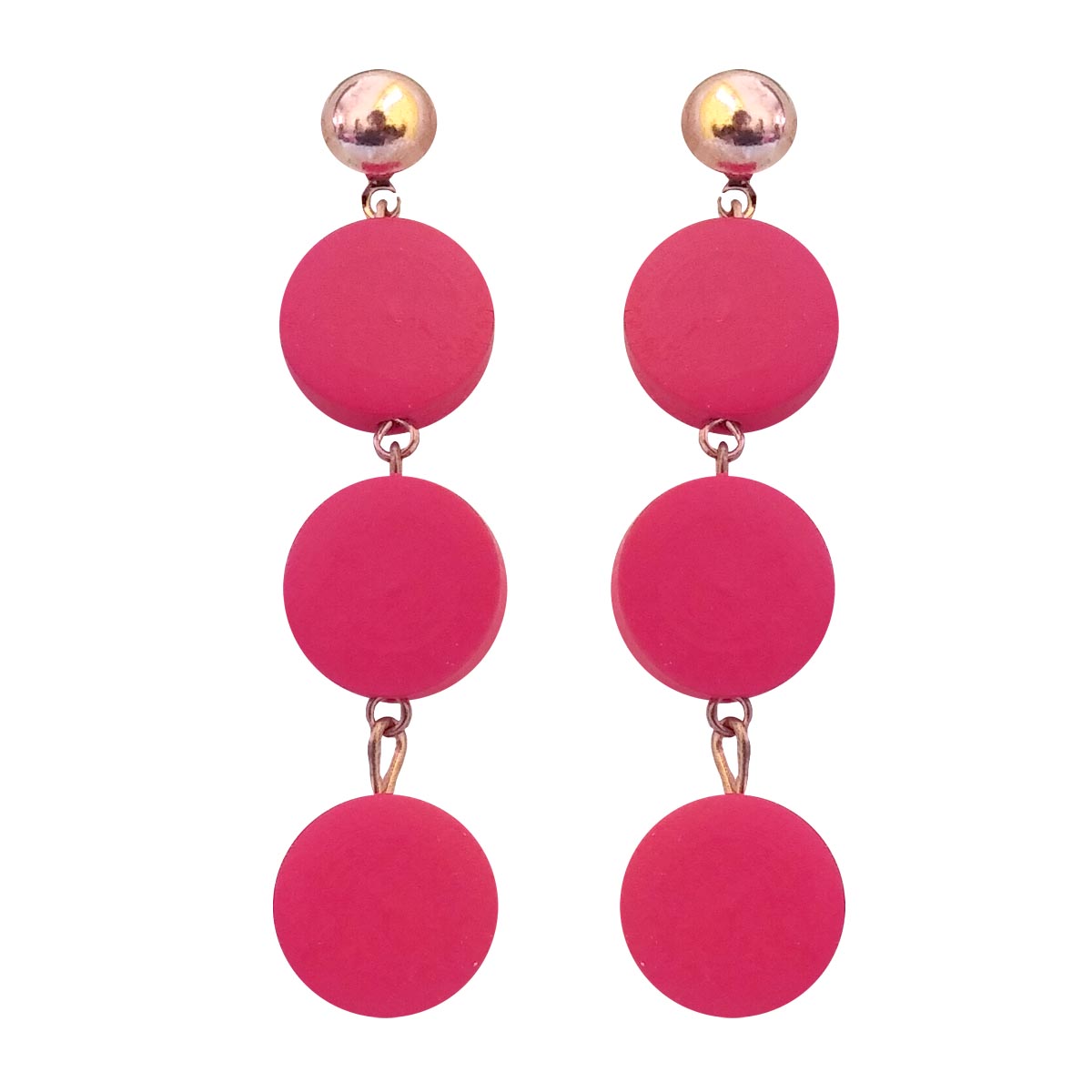 These elegant floral drop earrings feature soft rose-toned circular elements arranged in a cascading design, finished with a subtle metallic stud at the top. The smooth matte texture and fluid movement create a graceful silhouette that feels modern yet feminine. Lightweight and versatile, these earrings add a gentle pop of colour, making them perfect for both everyday wear and special occasions.