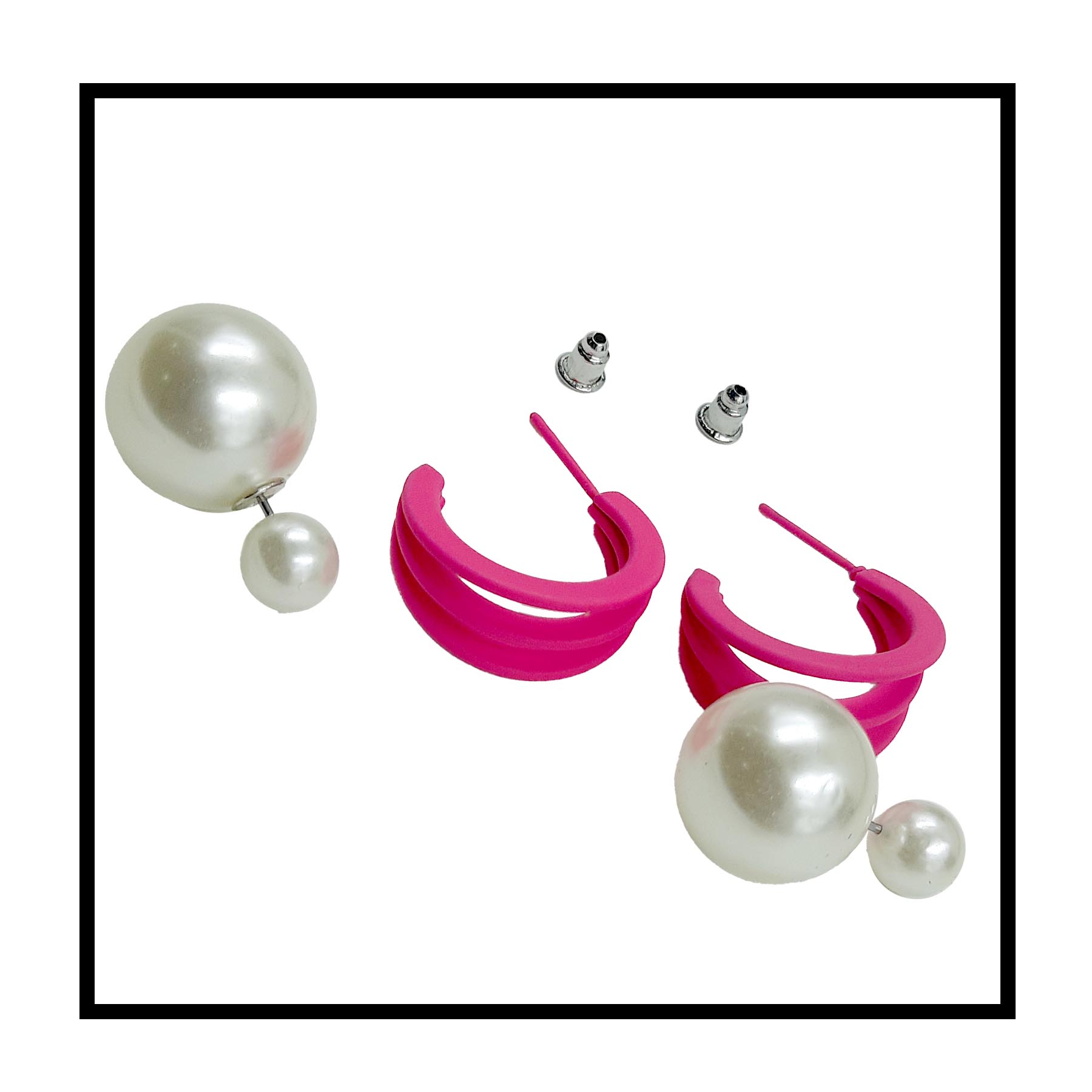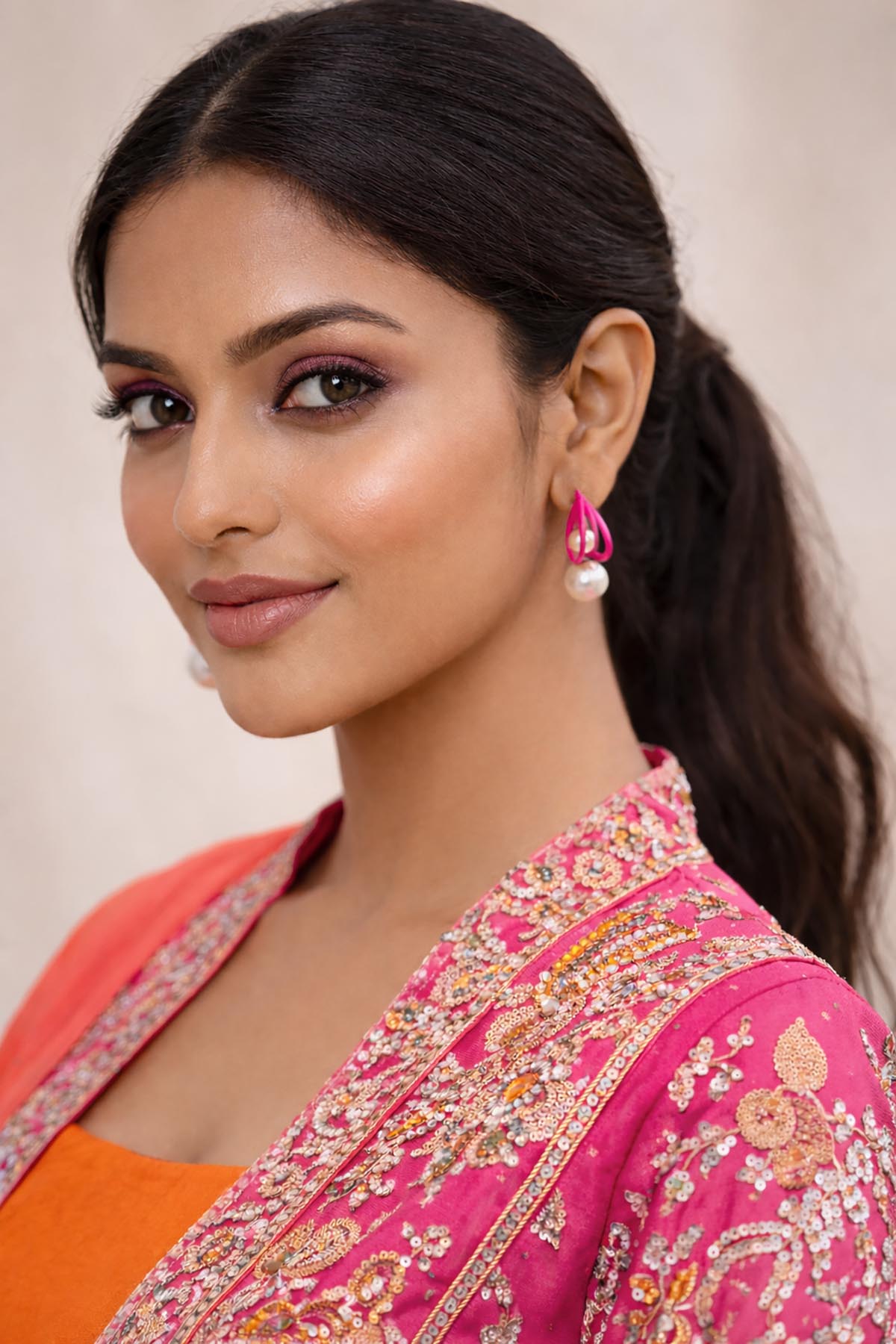 Vibrant, playful, and full of character—these pearl drop earrings feature a glossy ivory pearl paired with fluid rose-pink loops that add a bold contemporary twist. The striking colour brings energy to the timeless pearl, making these earrings a statement piece that’s still light and wearable. Perfect for those who love a pop of colour with effortless elegance.