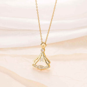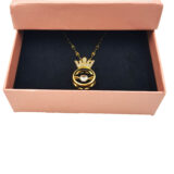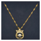 A stunning gold-plated pendant designed with a regal crown motif, beautifully encrusted with shimmering CZ stones. Below it rests a circular ring frame holding a sparkling solitaire at its center—symbolizing elegance, strength, and timeless charm. Paired with a textured, reflective chain, this necklace adds a luxurious touch to any outfit. Lightweight, classy, and eye-catching, it’s perfect for gifting or daily royalty-inspired glam.