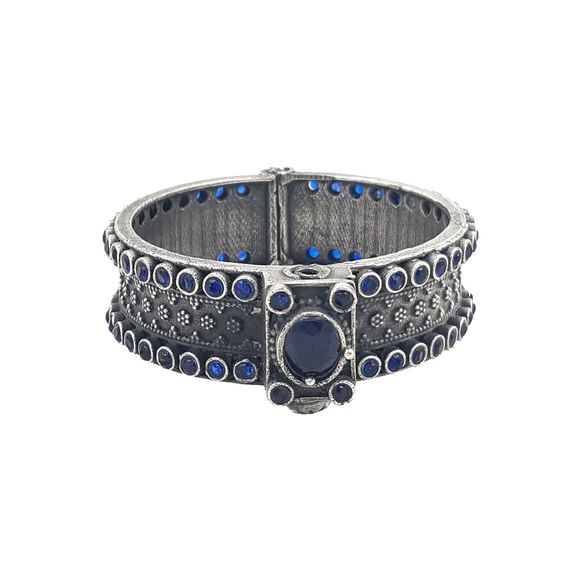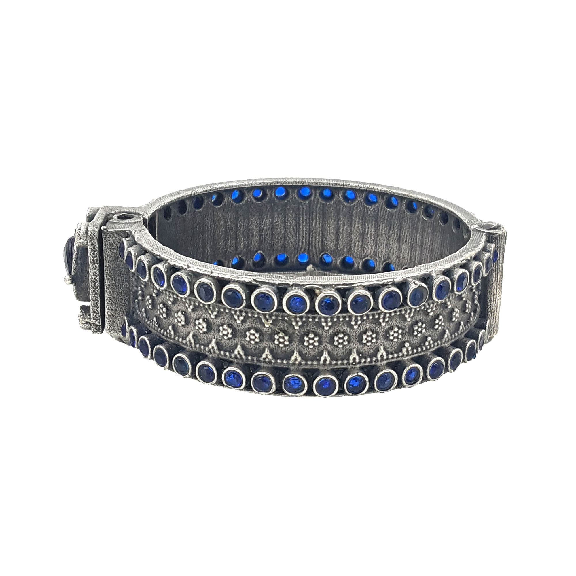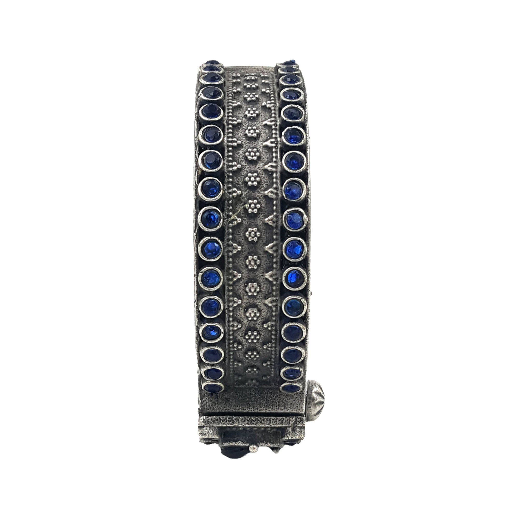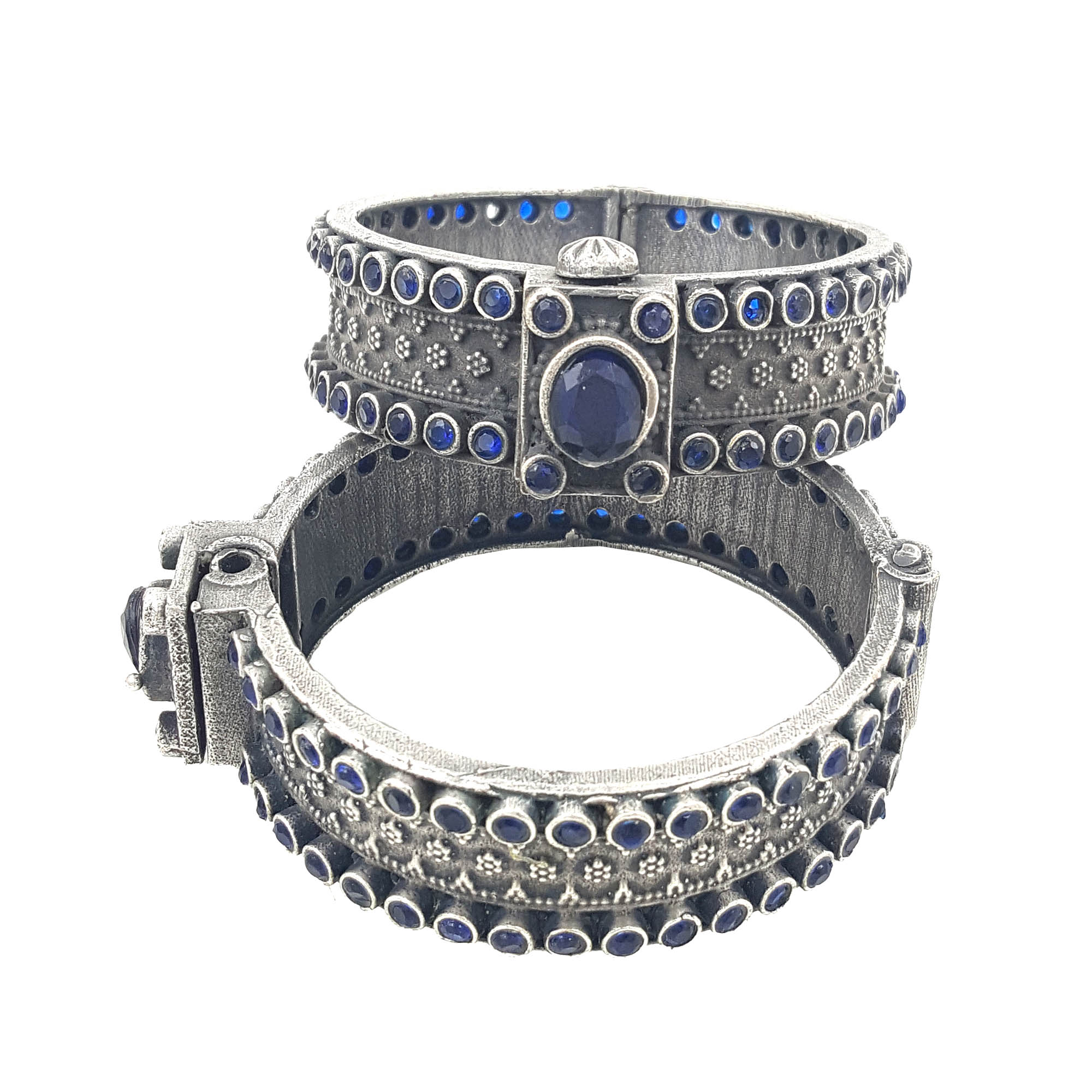 These striking oxidised kada bangles are adorned with deep indigo blue stones, intricately set against antique silver-tone metal. The detailed embossing and central gemstone give it a regal yet traditional appeal, perfect for making a bold statement. Ideal for festive wear or to elevate your everyday ethnic outfits.