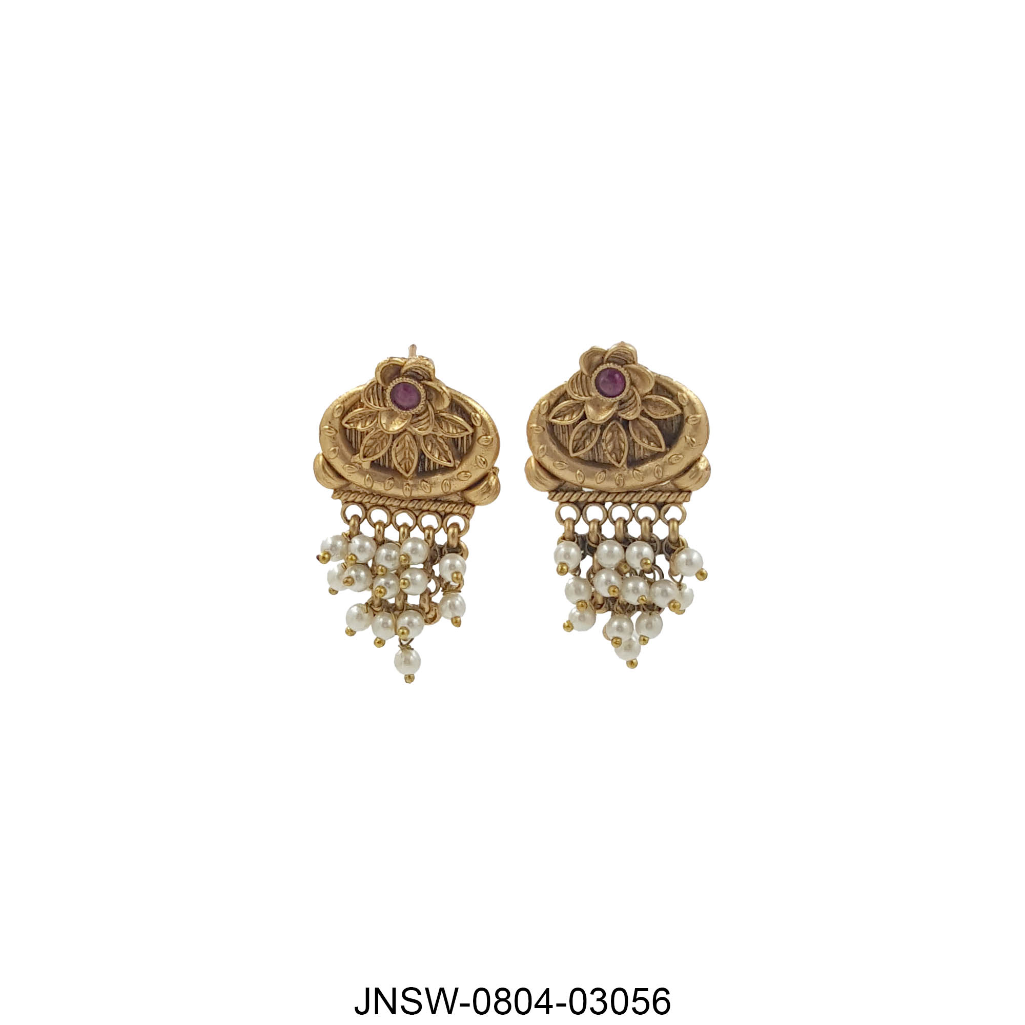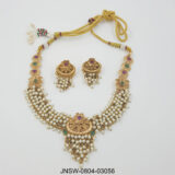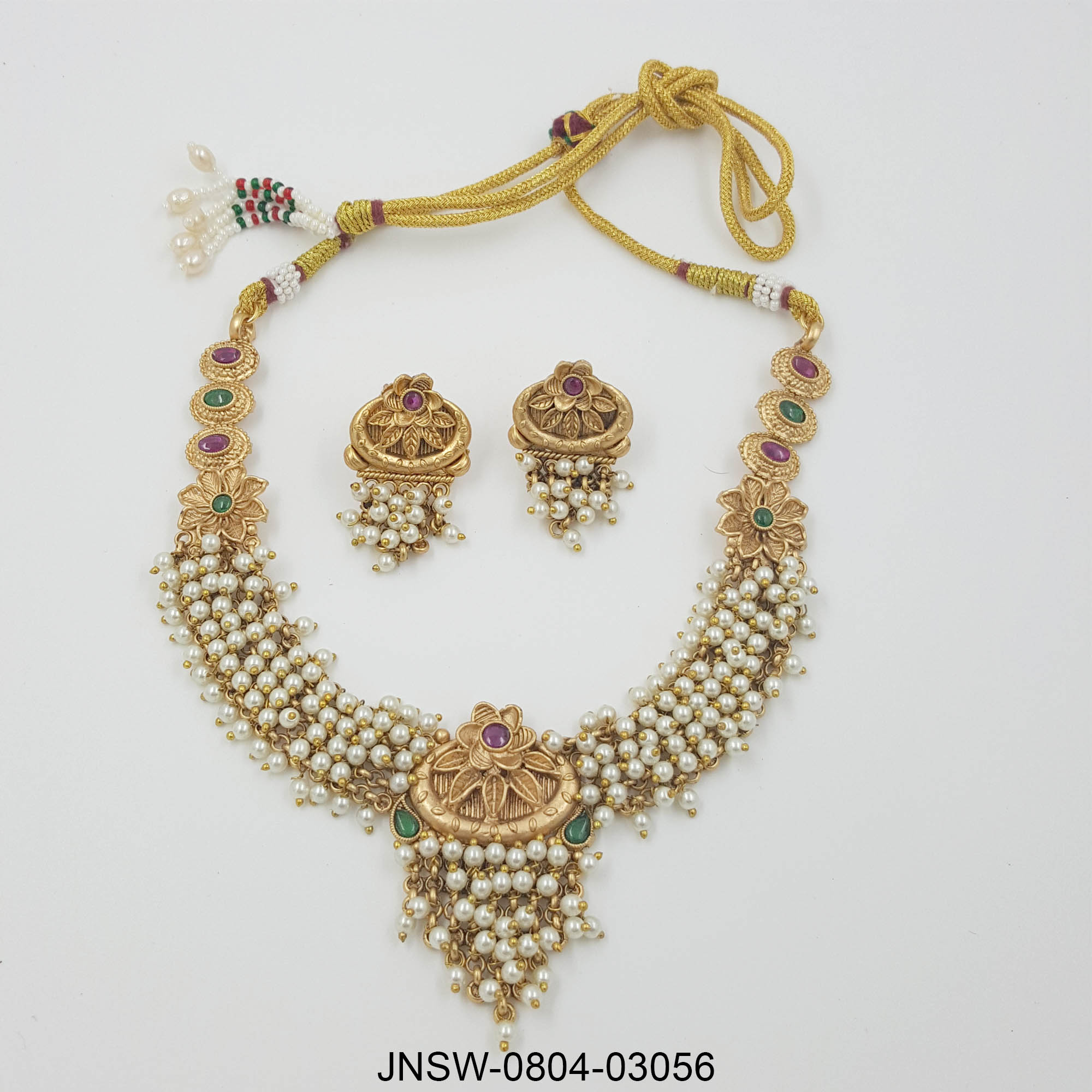 A majestic temple-inspired necklace set featuring multiple strands of lustrous pearls, accented with antique gold motifs and delicate coloured stones. The intricate centrepiece, paired with matching earrings, creates a rich and traditional aesthetic—perfect for festive events, weddings, and classic cultural looks. Elegant, timeless, and beautifully detailed.