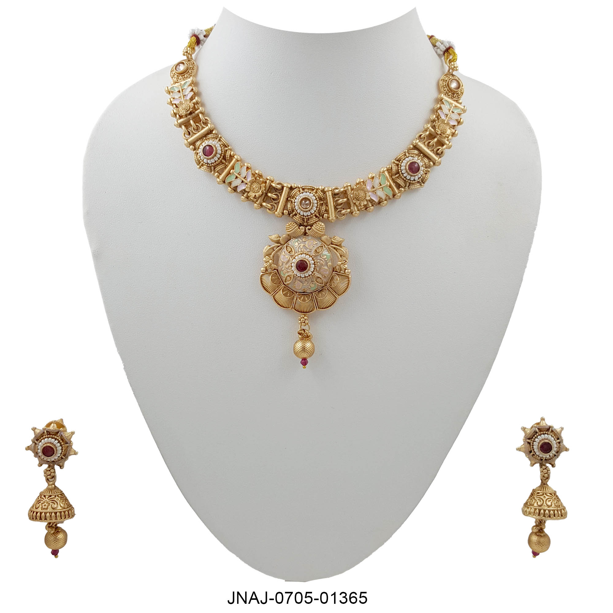 An ode to traditional craftsmanship, this antique gold necklace set features a stunning ruby-red stone at the center of its intricately carved floral pendant. Accented with soft enamel detailing and paired with classic jhumka earrings, this set brings timeless beauty to festive attire and heritage looks alike.