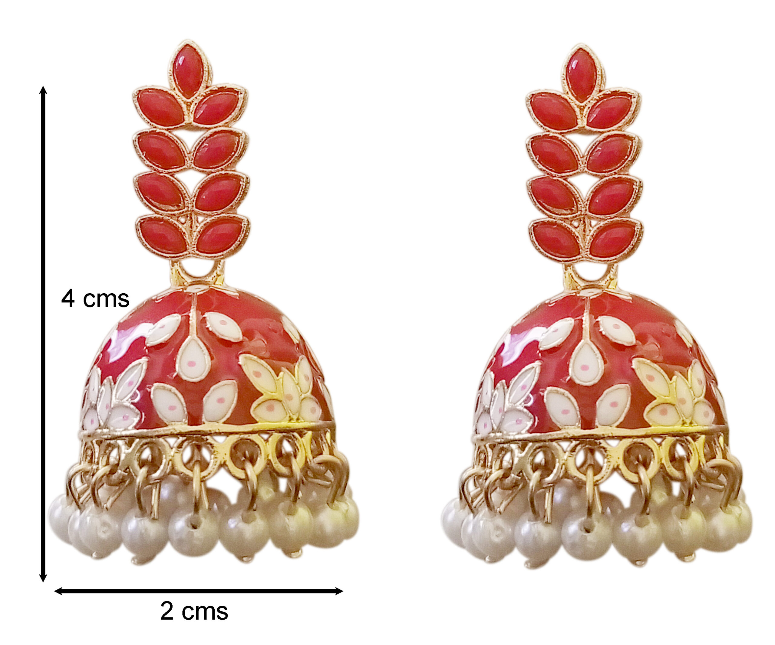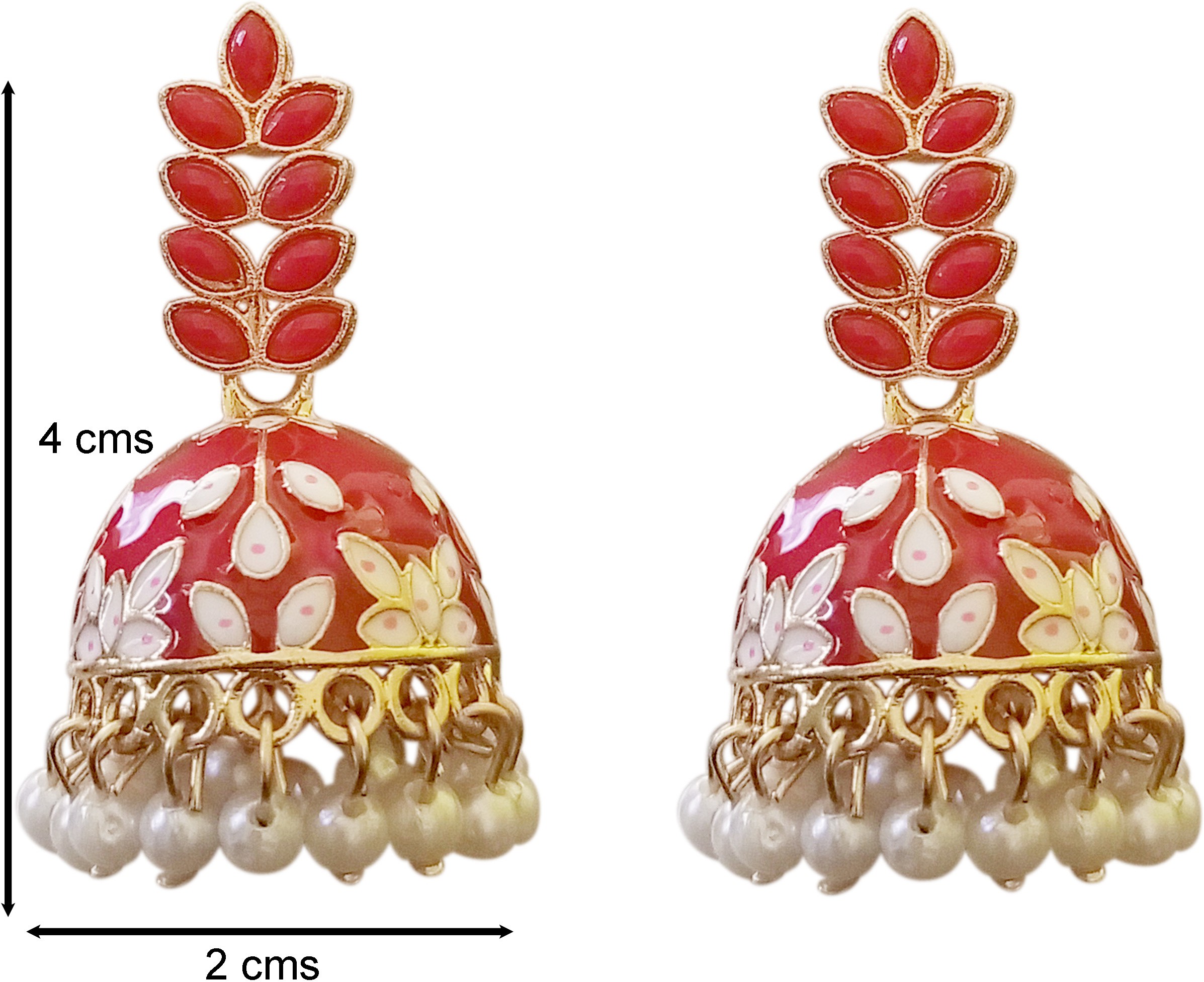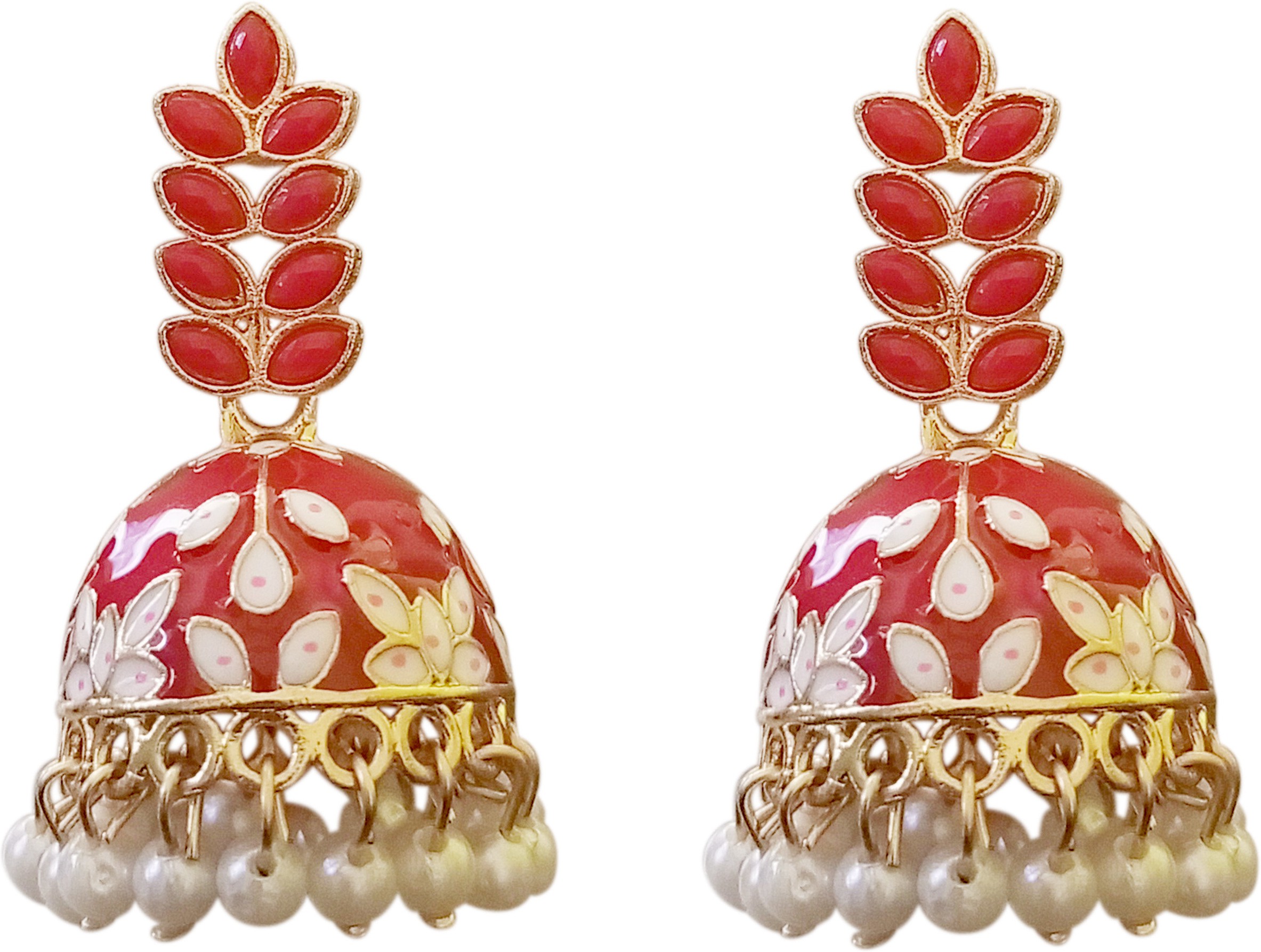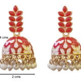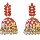 These ruby red enamel floral jhumki earrings add a rich and festive glow to any ethnic look. The glossy red dome is hand-painted with delicate floral motifs that bring out its traditional charm. Accented with a gold-tone framework and finished with soft pearl drop danglers, they move gracefully with every step. The layered petal design on top enhances the elegant silhouette. Perfect for weddings, festivals, and celebratory occasions.