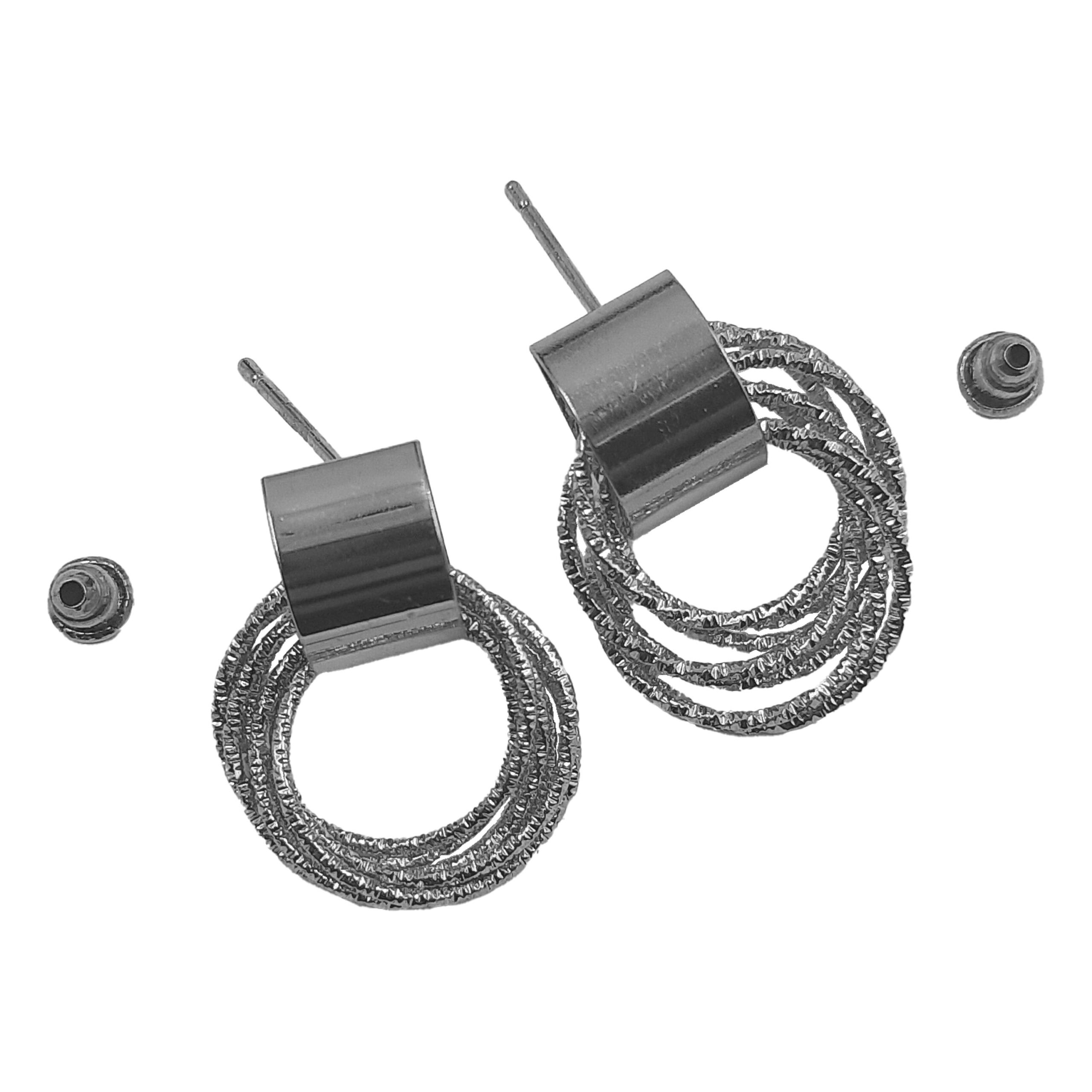 Sleek silver-toned earrings with layered textured loops that add instant shine and movement. They are lightweight, comfortable, and perfect for all-day wear without feeling heavy. The modern circular design gives a bold yet elegant look to any outfit. Easy to style with both western and fusion wear for a chic finish.