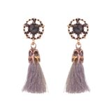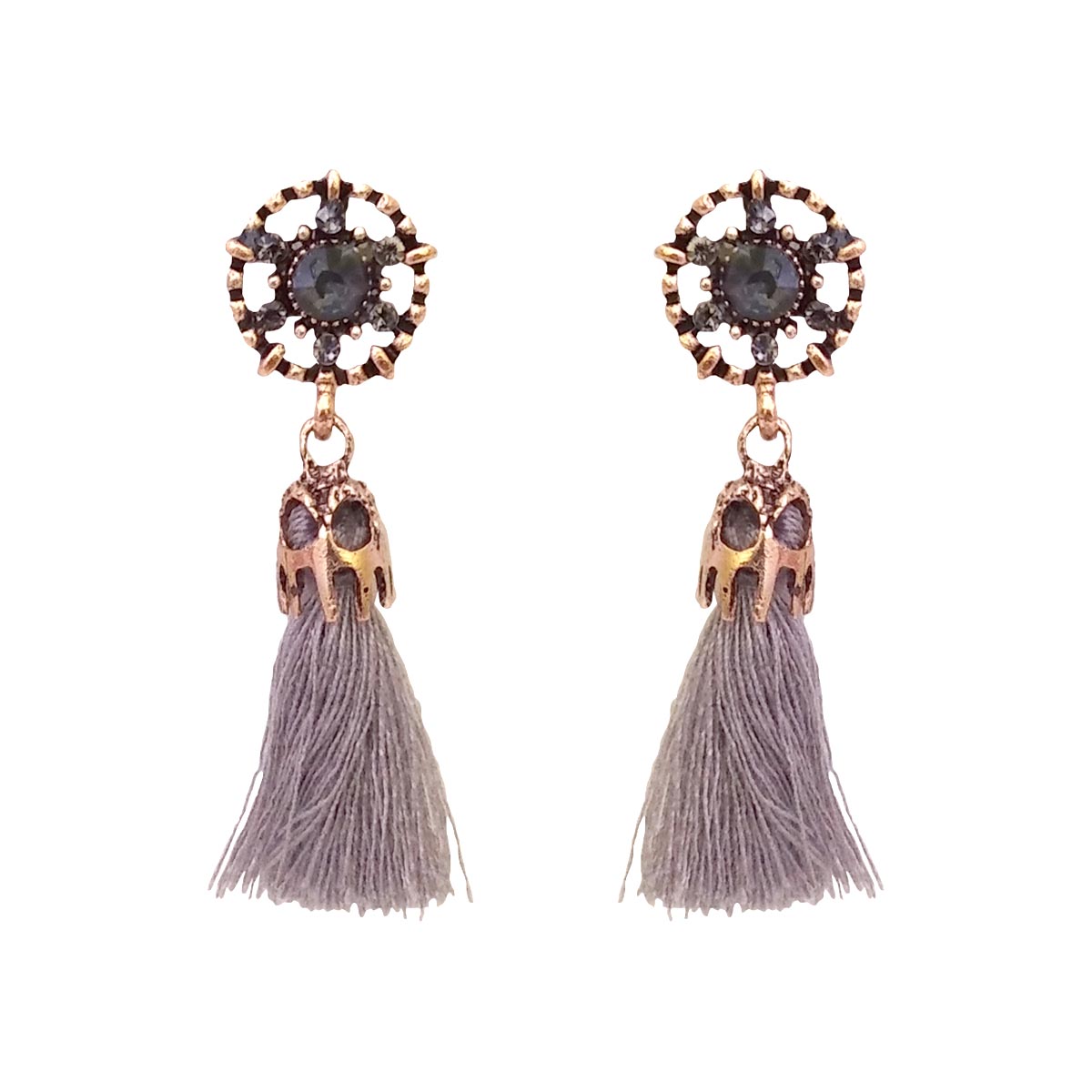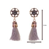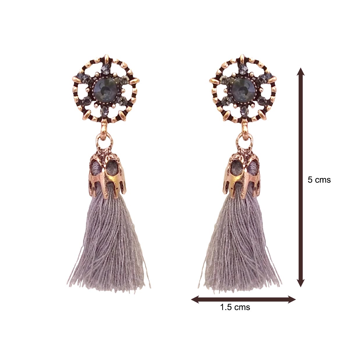 These elegant tassel drop earrings feature a detailed floral stud with a smoky grey stone at the centre, accented by subtle crystal highlights and an antique gold finish. The design flows into soft grey tassels capped with textured metal detailing, adding graceful movement and depth. With a muted yet striking colour palette, these earrings blend vintage charm with modern elegance.