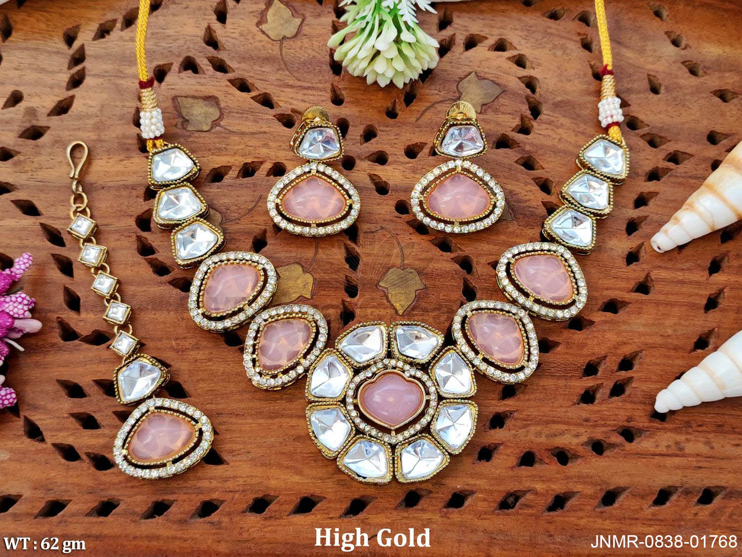 This elegant traditional jewellery set features a radiant high-gold finish beautifully adorned with classic Kundan Polki work and soft blush-pink stones. The floral-inspired centerpiece is delicately framed with hand-set Polki stones, giving the set a graceful and feminine charm. Paired with matching earrings, this handcrafted design reflects timeless Indian artistry, making it ideal for weddings, festive occasions, and intimate celebrations. Lightweight yet striking, it adds a refined traditional touch to any ethnic ensemble.