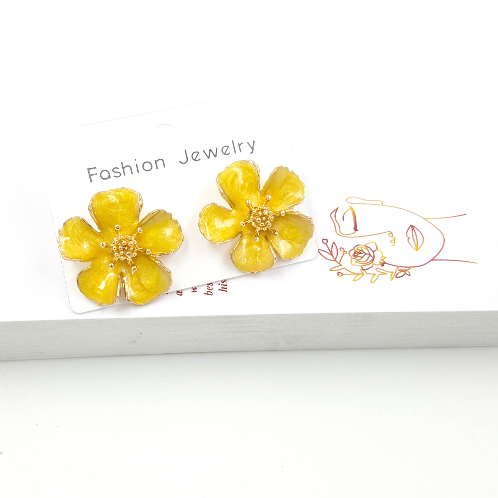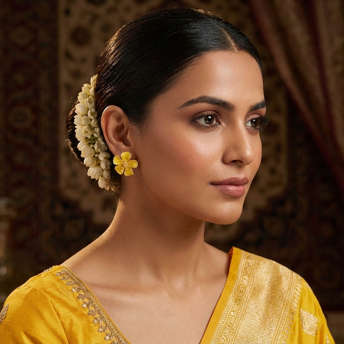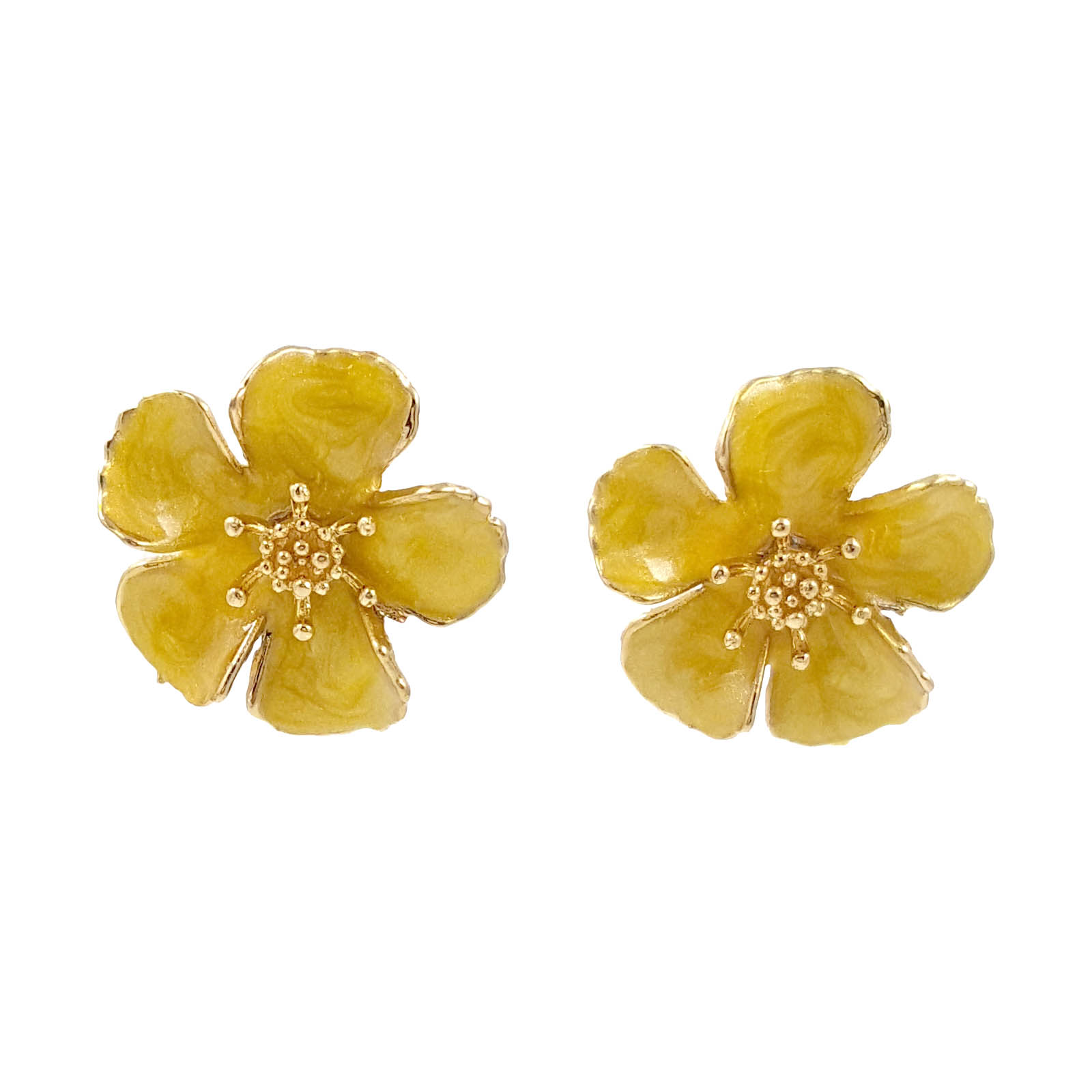 Bright and uplifting, these yellow floral stud earrings feature softly textured enamel petals framed with delicate gold-toned edges. The warm yellow hue adds a joyful touch, while the detailed centre enhances the handcrafted appeal. Lightweight and elegant, these studs are perfect for adding a fresh burst of colour to your everyday style.