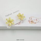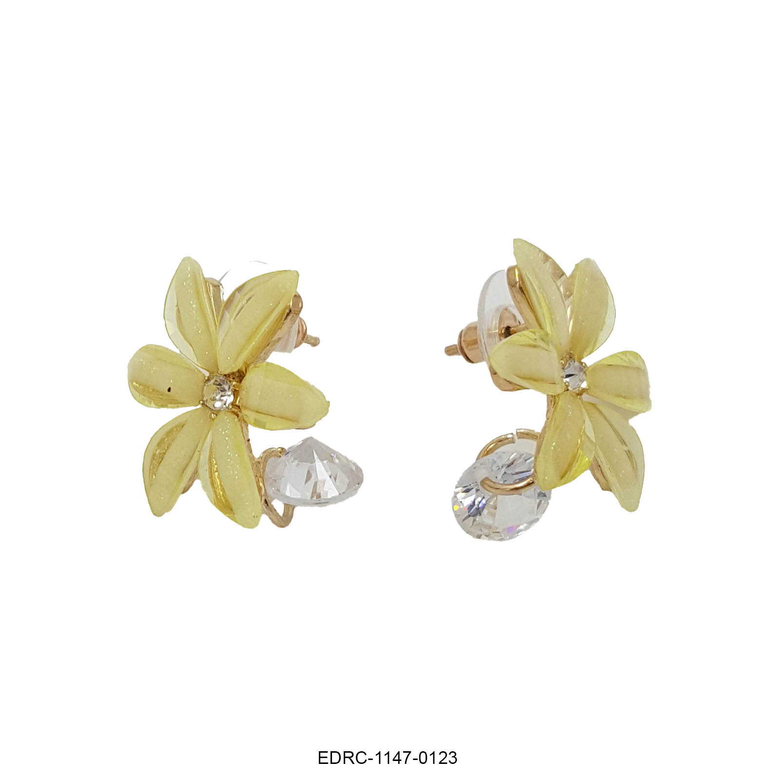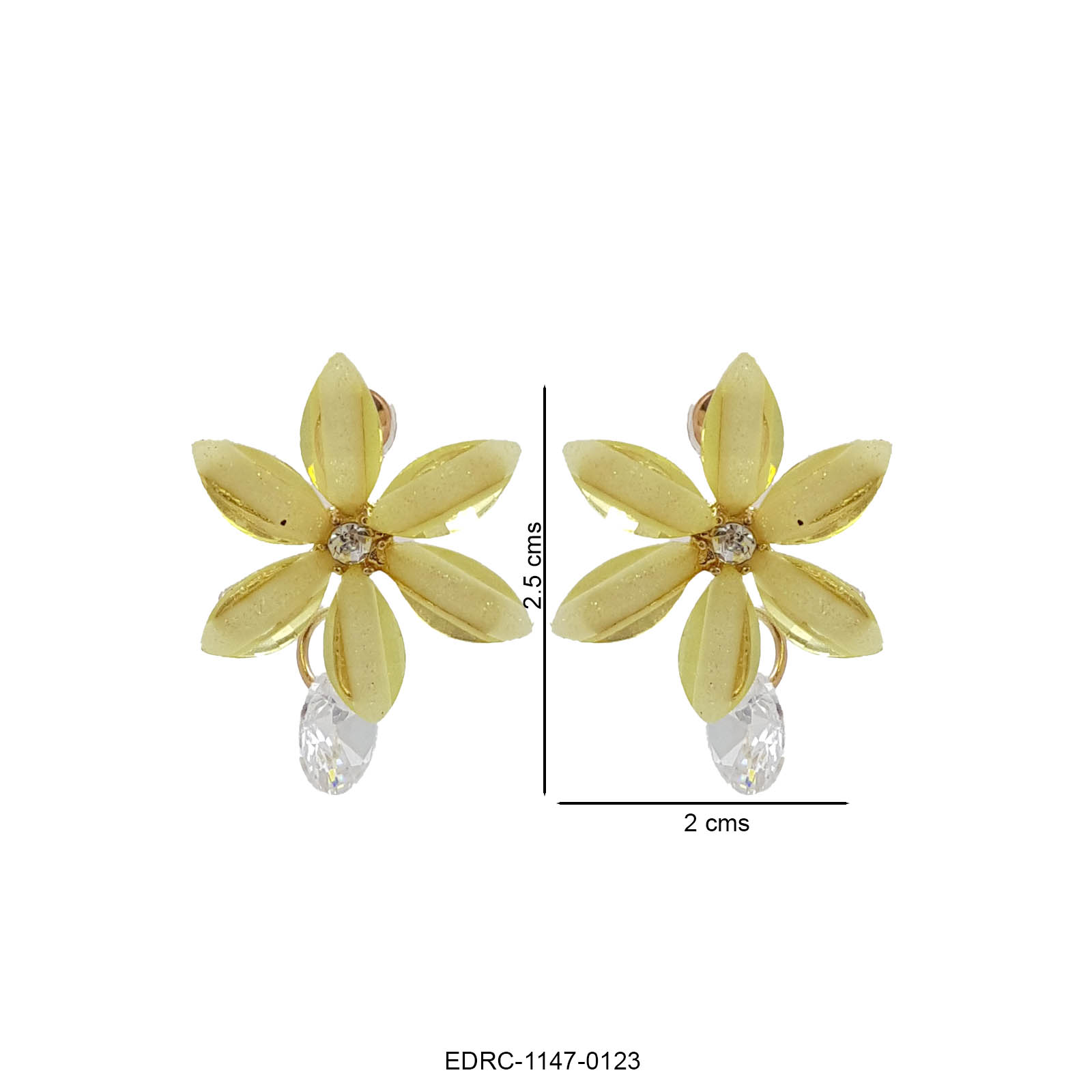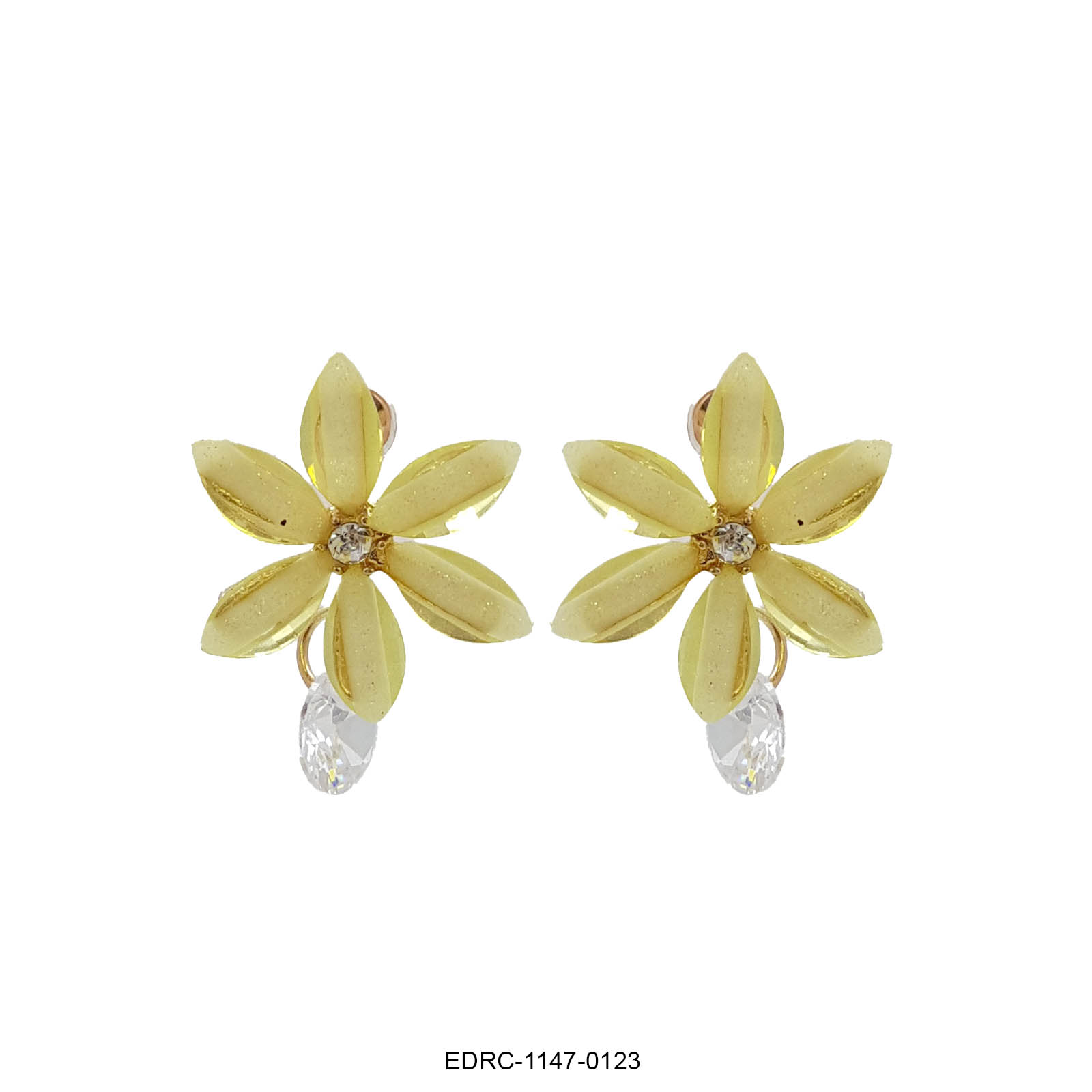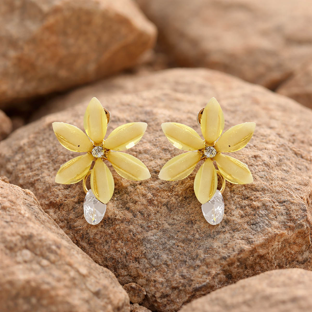 These charming floral drop earrings feature soft yellow petal-shaped stones arranged in a delicate flower design, highlighted with a sparkling crystal centre and a graceful crystal drop beneath. The warm pastel yellow hue paired with gold-toned accents brings a fresh, cheerful elegance to the piece. Lightweight and luminous, these earrings add a subtle glow and gentle movement, making them perfect for daytime and festive styling.