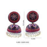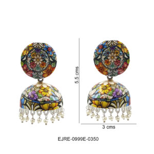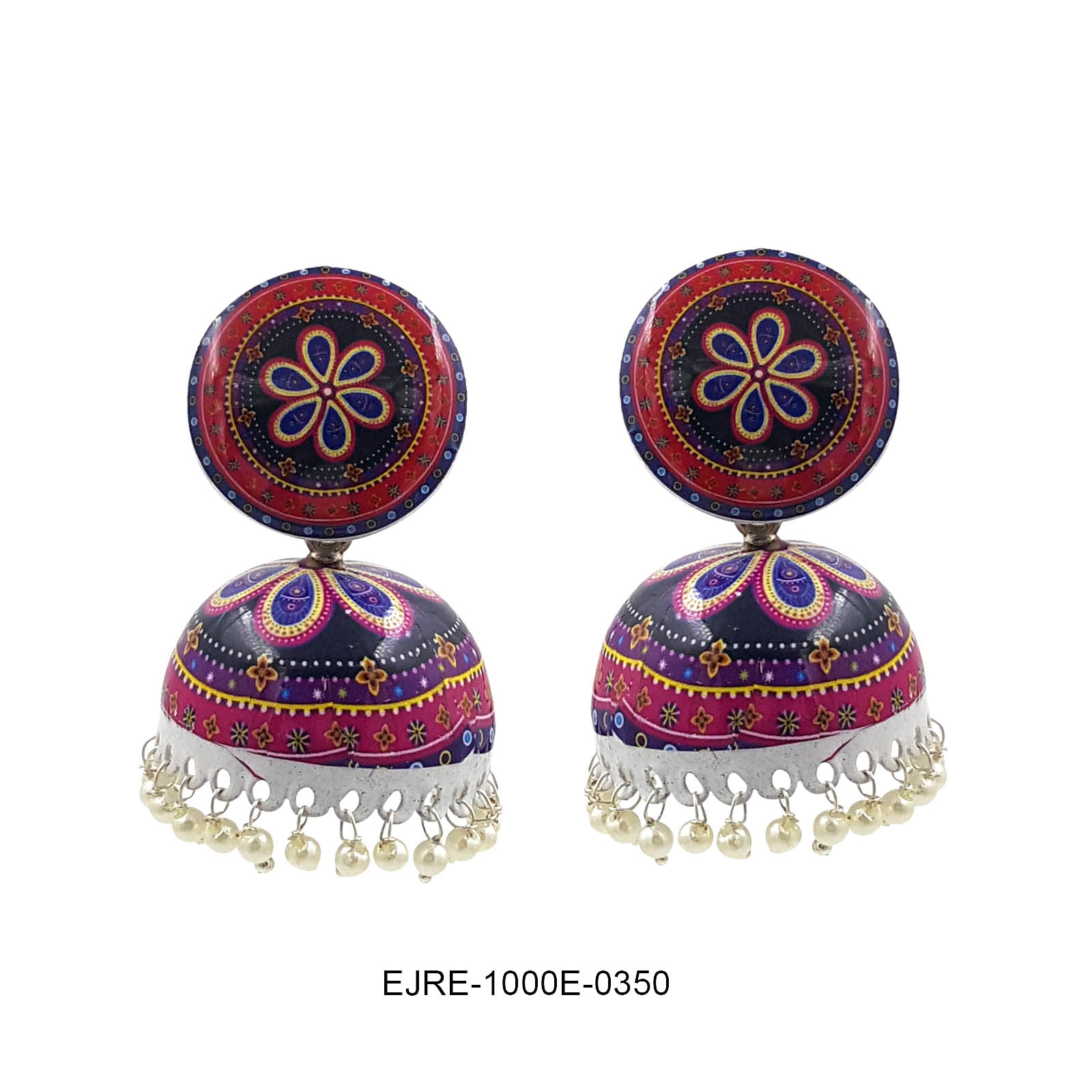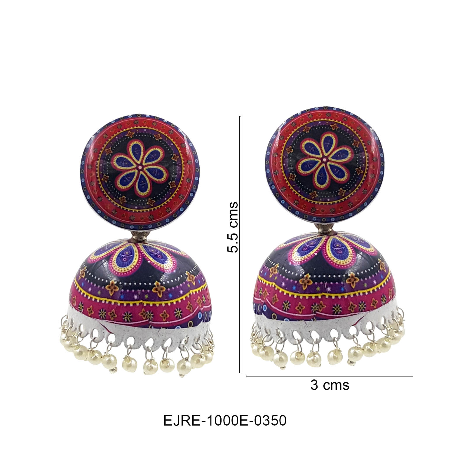 Bright and festive, these traditional hand-painted Jhumka earrings feature intricate patterns in bold shades of navy blue, pink, and red, highlighted with golden detailing. The dome-shaped design is beautifully finished with delicate pearl drops, making this pair a perfect balance of tradition and elegance. Lightweight and versatile, these earrings are ideal for festivals, weddings, and cultural occasions.